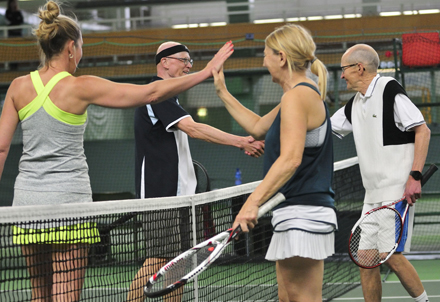 Vuorovuosina Tallinnassa ja Helsingissä pelattavan sekanelinpelitapahtuman kantava ajatus on se, että naiset tulevat Virosta ja miehet Suomesta ja että pareja vaihdetaan otteluiden välillä. Yllä kuvassa erään pelin päätös. Kättelemässä Triin Mägi, Pete Pihko, Marina Hundt ja Henri Bucht.