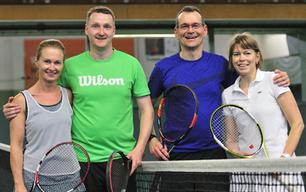 Virolaisten leidien ja suomalaisten gentlemannien vuotuinen tennisturnaus Tennis Fiesta pelattiin Talin Tenniskeskuksessa. Perinteinen turnaus vietiin lämminhenkisessä tunnelmassa. Kuvassa Anneli Alajaan, Nicklas Hilska, Jorma Mäkitalo ja Kristel Meos oman ottelunsa jälkeen. Tunnelma pysyi katossa myös illanvietossa.