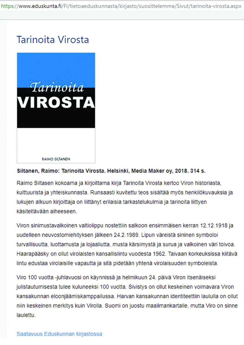 Tämä Raimo Siltasen kokoama ja kirjoittama kirja täydentää suomalaisten hieman puolinaista Viro-kuvaa, suuri osa virolaisuutta kun tahtoo jäädä päiväristeilylle tai kylpylälomalle lähteviltä pimentoon. Suotavaahan olisi, että meillä suomalaisilla olisi jonkinlainen kokonaiskäsitys naapuristamme ja siellä asuvasta sukulaiskansasta.
